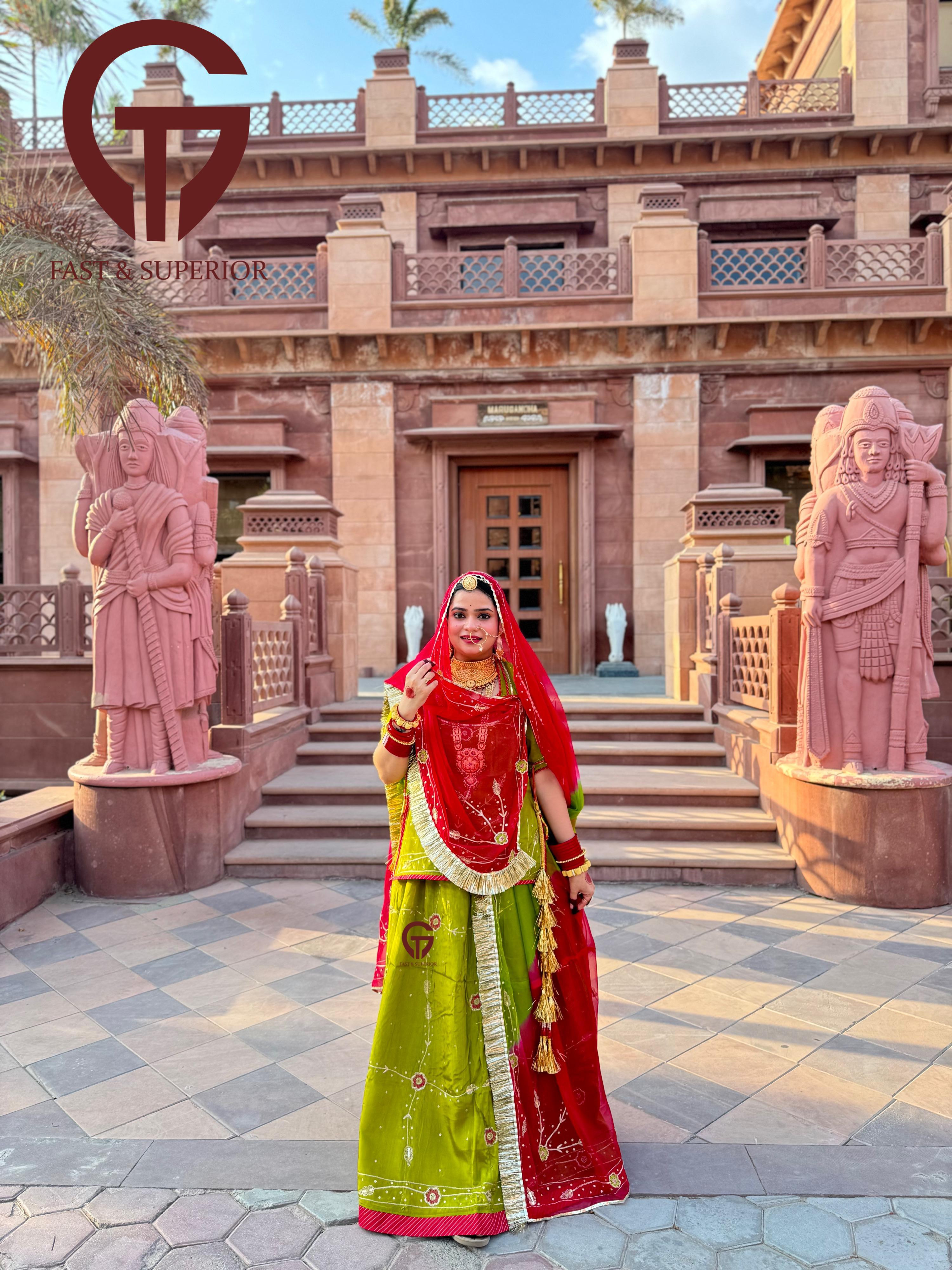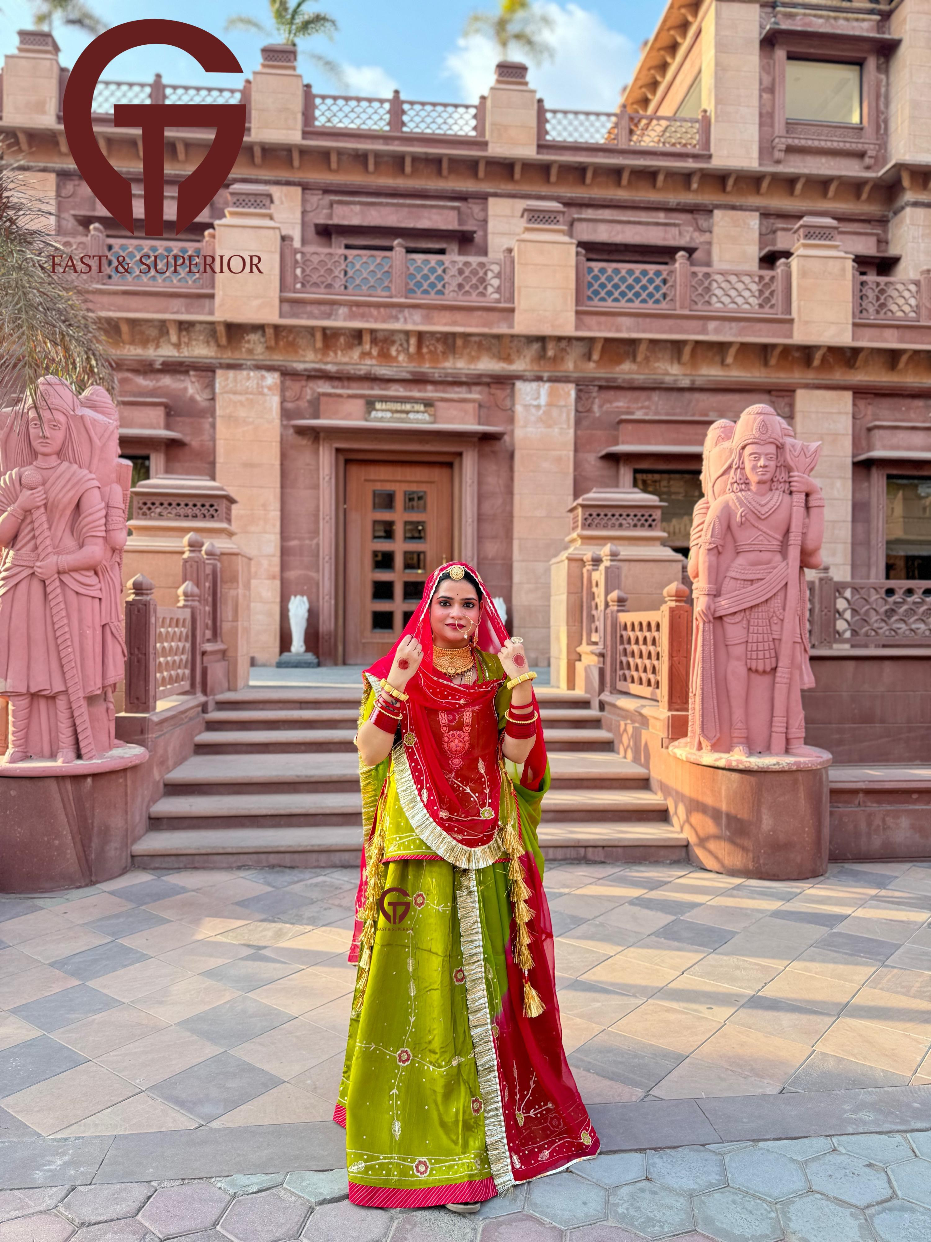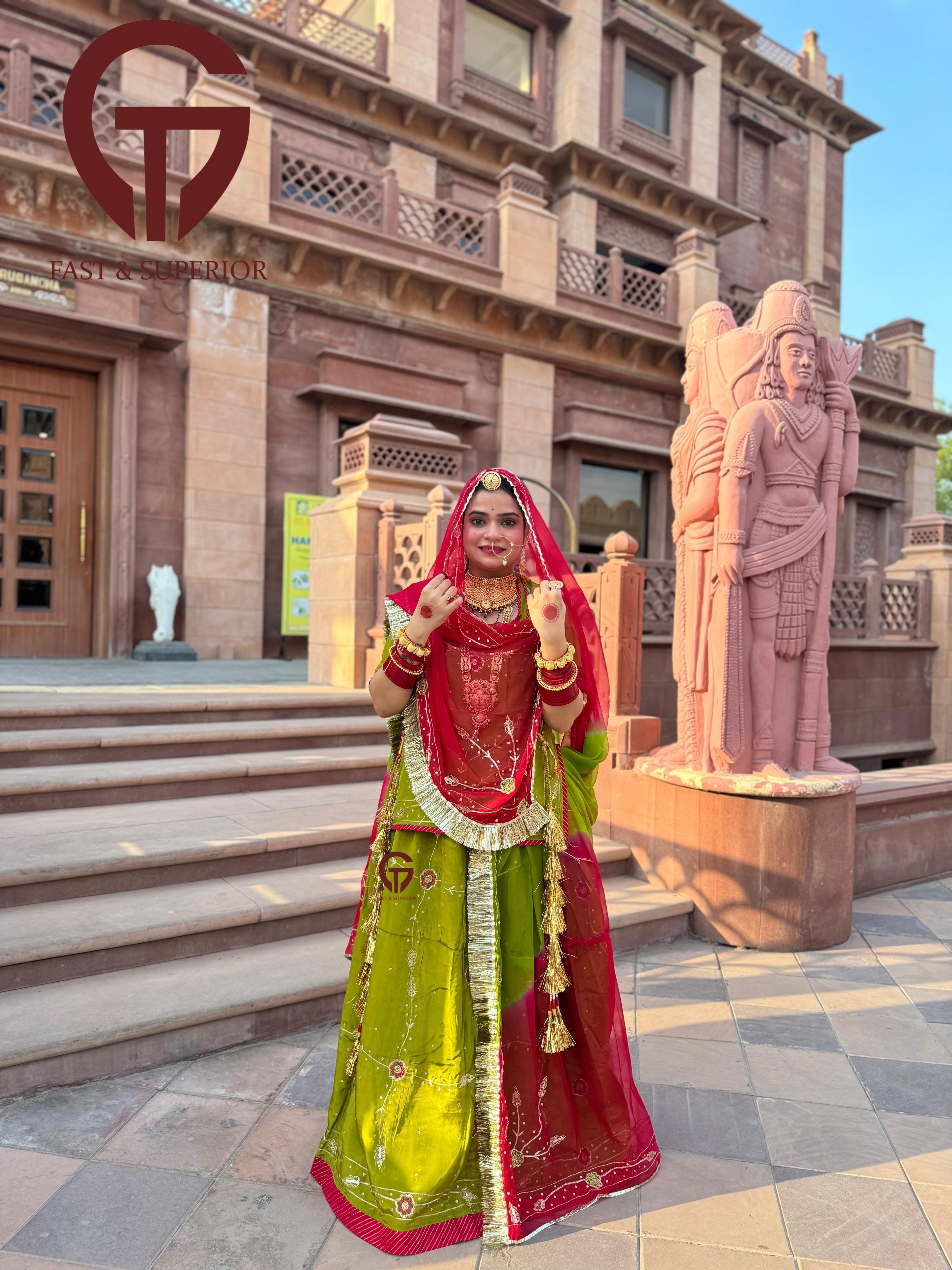 Red Mehandi Multi Coloured Branded Natural Crepe Humrahi Rajputi Poshak