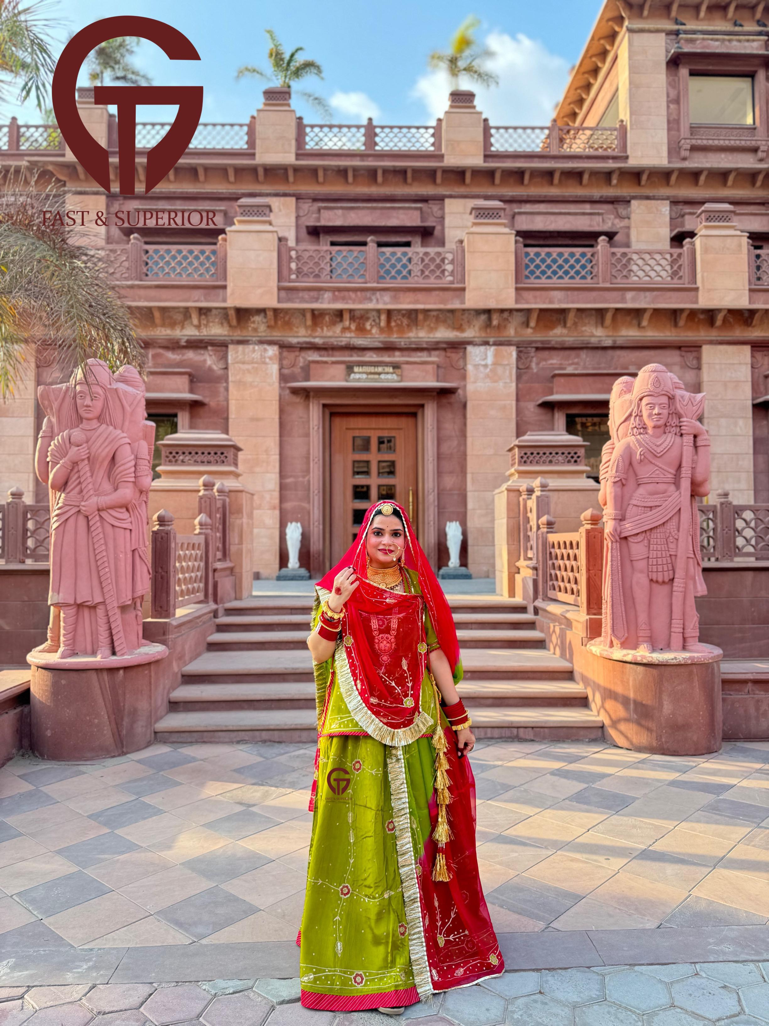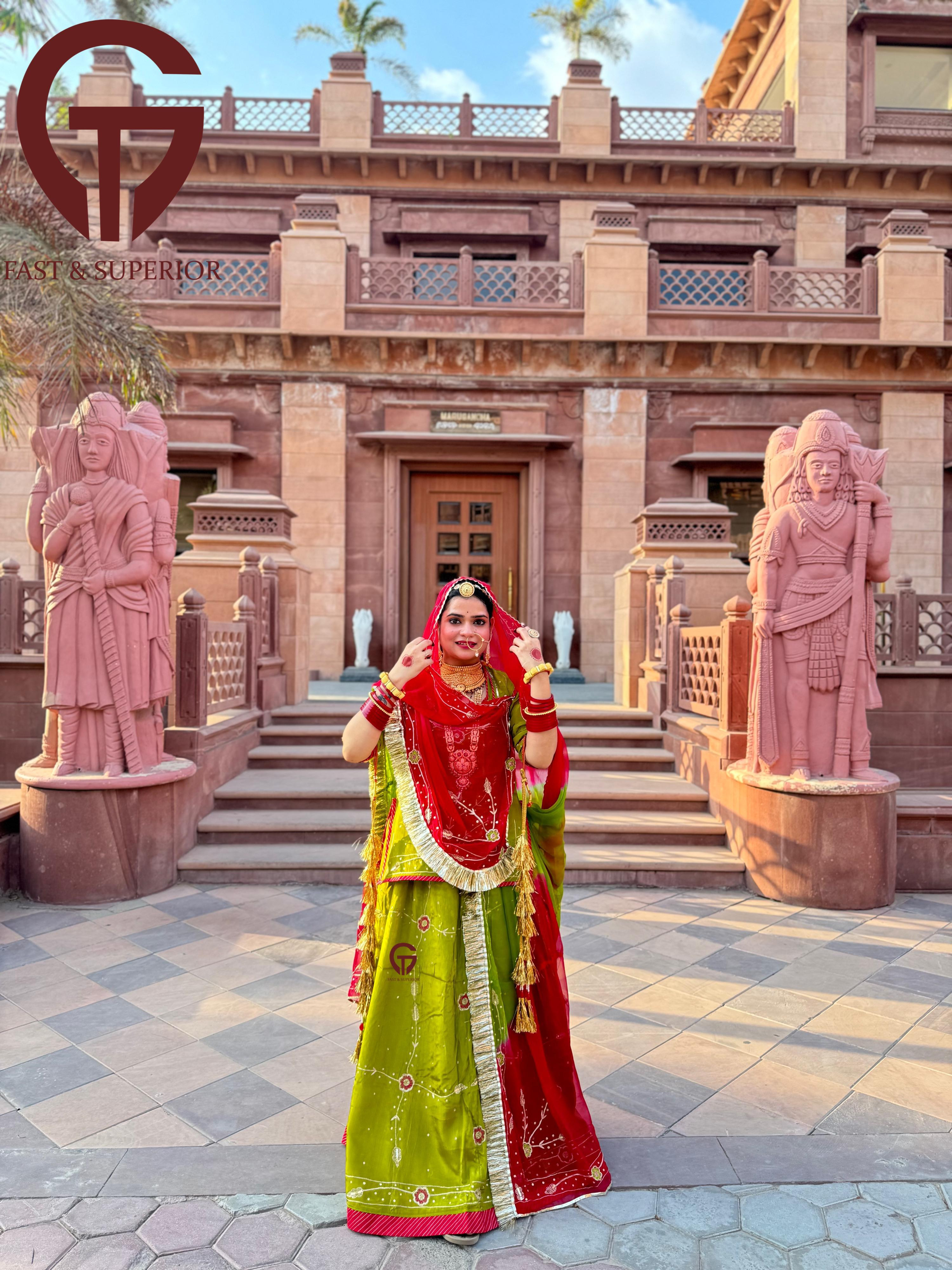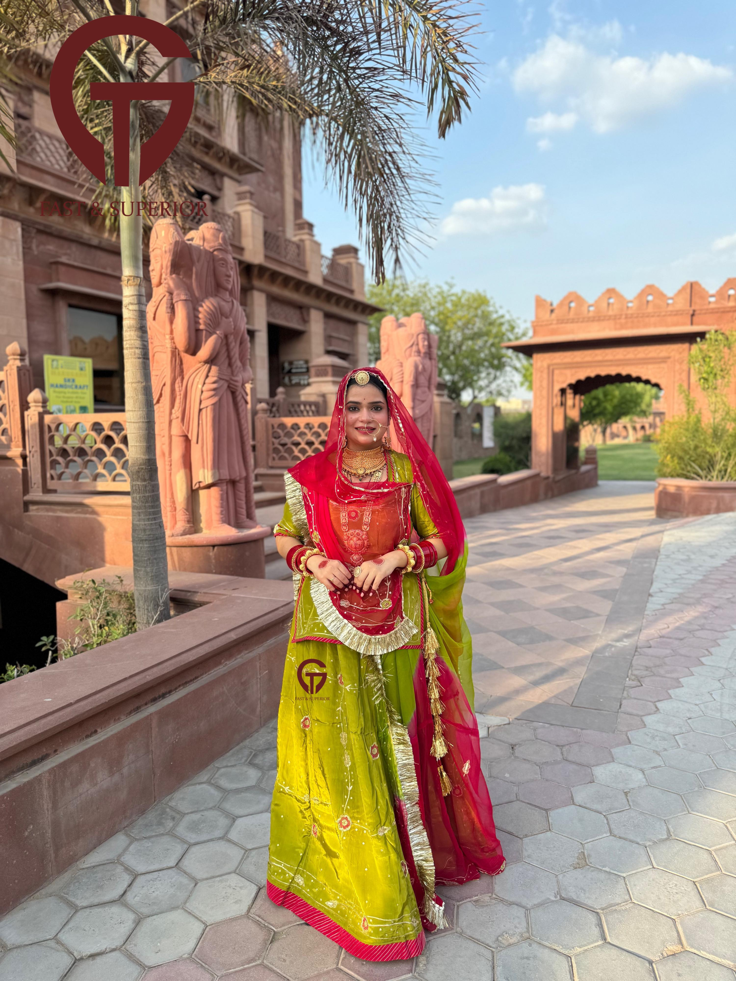 Red Mehandi Multi Coloured Branded Natural Crepe Humrahi Rajputi Poshak
