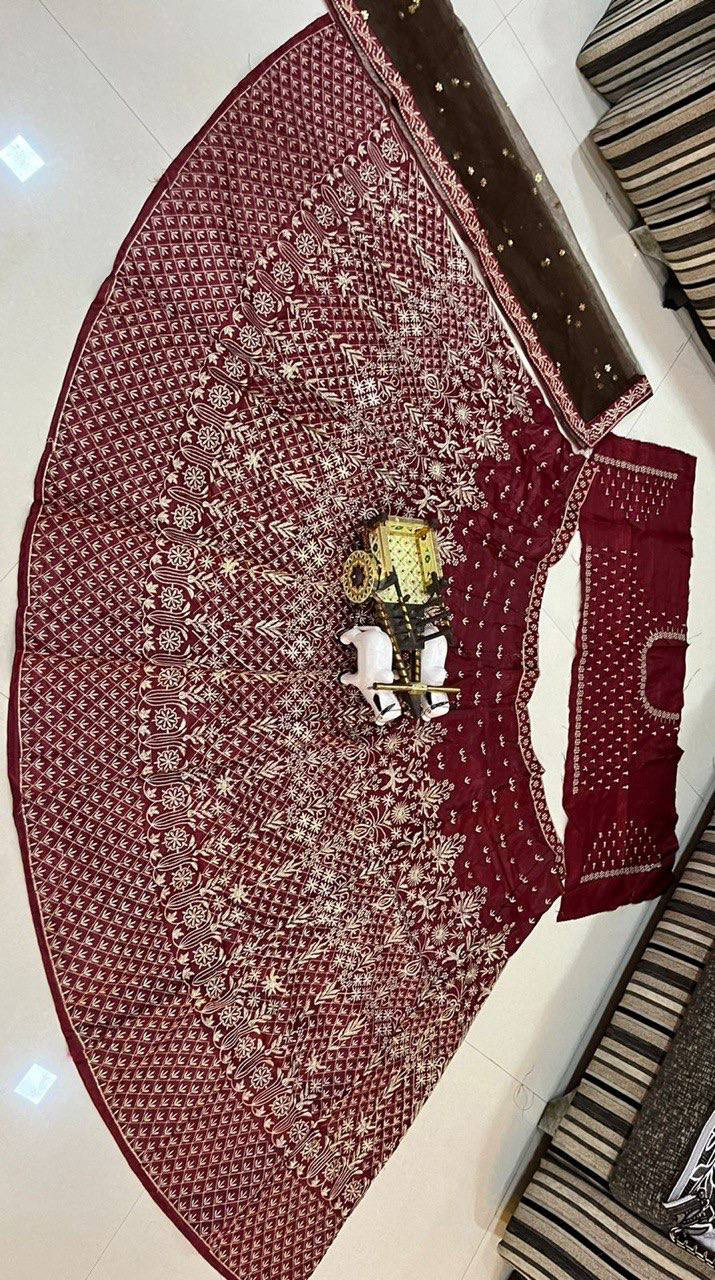 Elevate your ethnic wardrobe with this stunning Satin Silk Lehenga adorned with intricate embroidery work. Perfect for weddings, festive occasions, or special events.