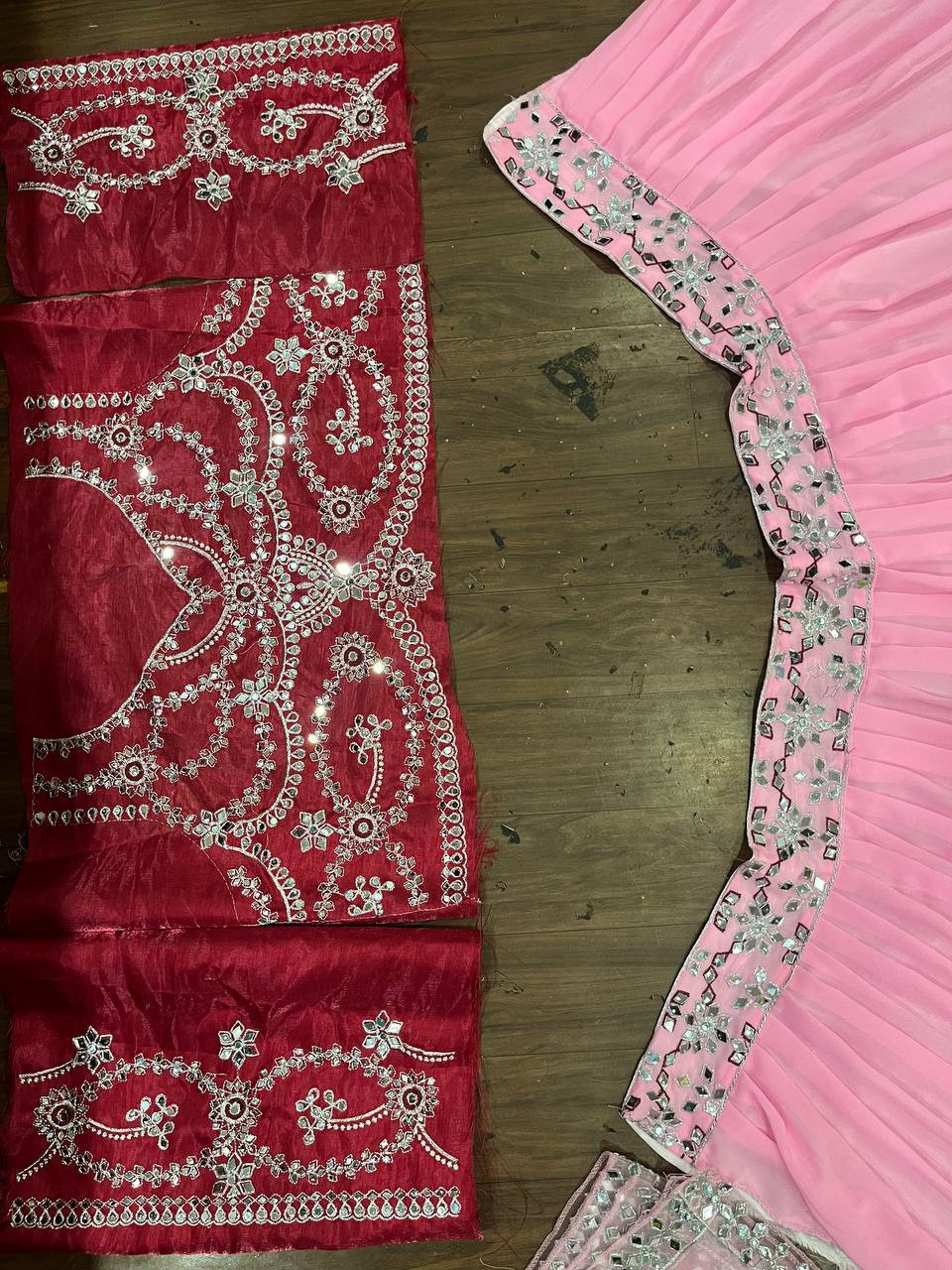 Paired with a matching mirror-embroidered blouse and a beautifully detailed dupatta, this ensemble is ideal for weddings, sangeet nights, and festive occasions.