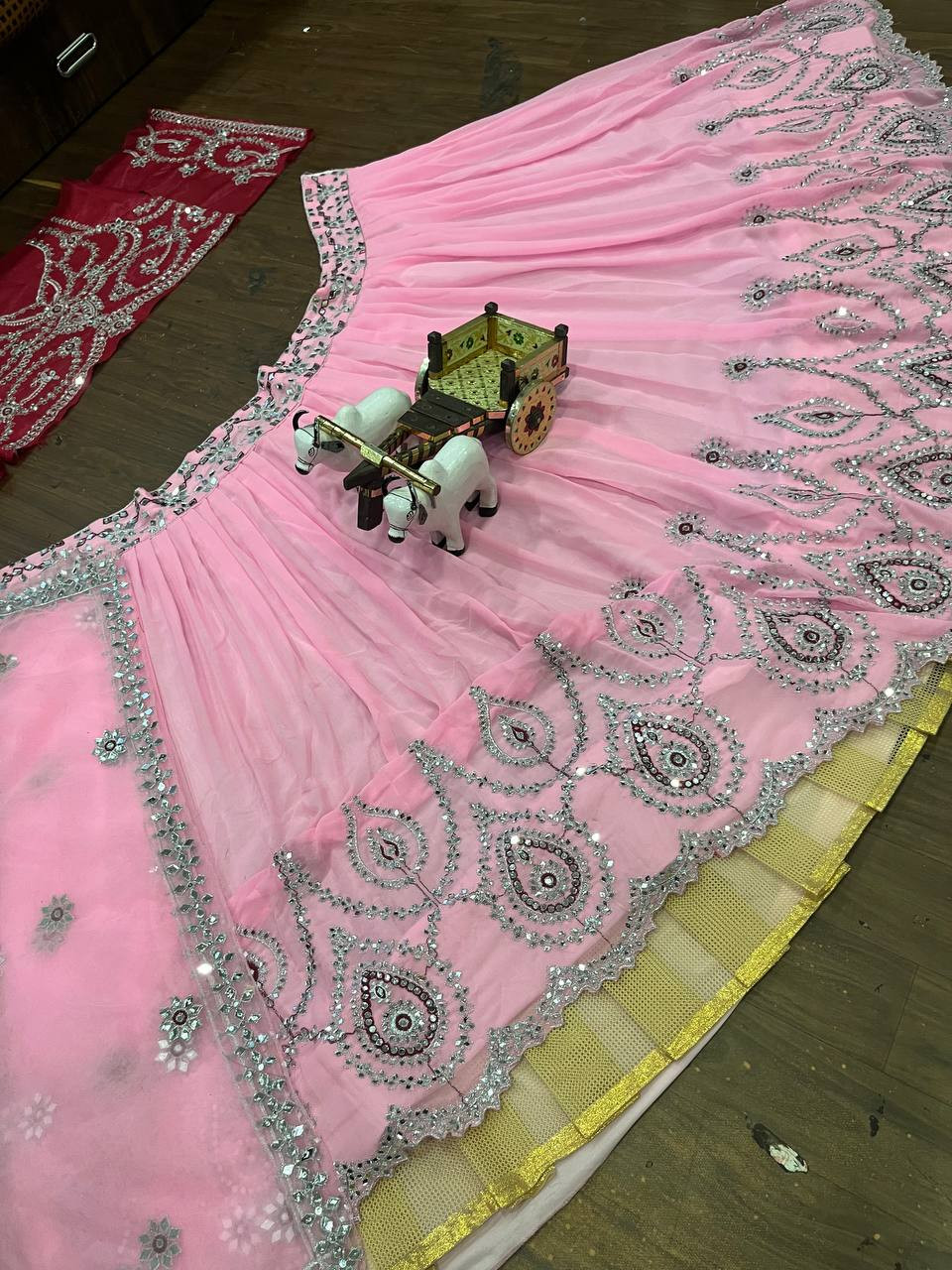 Crafted with premium Fox Georgette fabric, this semi-stitched lehenga features authentic mirror embroidery work, giving it a radiant, festive charm. The 3.5-meter flare adds grand volume, supported by Can-Can and Canvas layers for a royal silhouette.