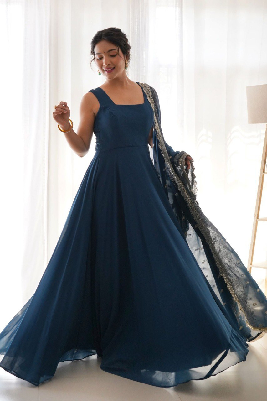 Elevate your ethnic style with this Solid Georgette Stitched Anarkali Gown with Dupatta, designed for grace and comfort. Crafted from premium georgette fabric, this gown comes with a full inner lining for a perfect drape. The solid Anarkali silhouette paired with a stunning embroidered cutwork dupatta with designer border makes it a versatile pick for festive occasions, weddings, and parties.