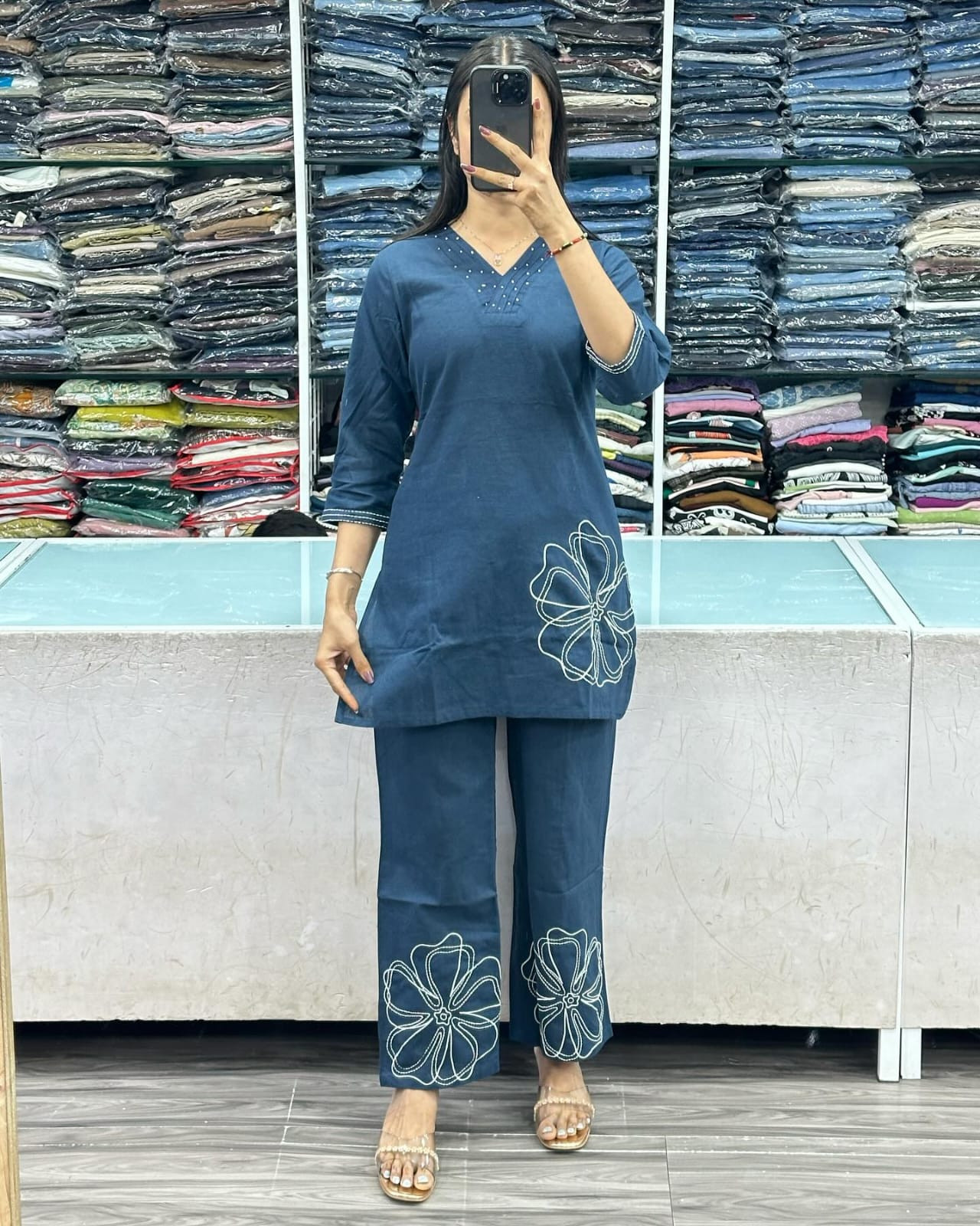 Top: Printex with Moti Work on Neck, Katha Work on Sleeves & Embroidery