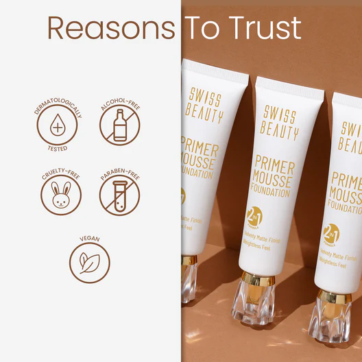 Get a flawless, shine-free complexion with Swiss Beauty Primer Mousse Foundation – a perfect 2-in-1 formula that works as both a primer and foundation. Designed with a lightweight mousse texture, this foundation creates a smooth canvas while delivering a soft, natural matte finish.