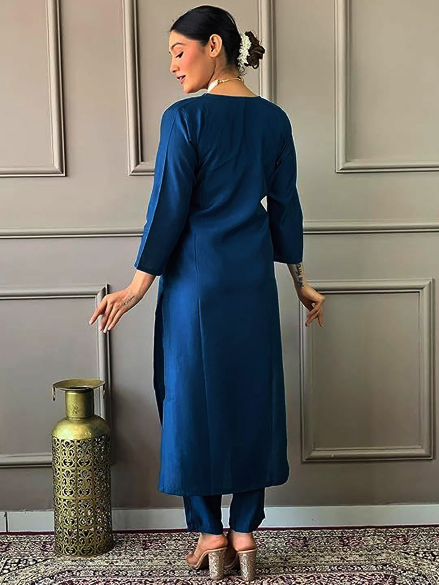 Elevate your ethnic style with this elegant Women’s Kurta Pant Dupatta Set, crafted for comfort and sophistication. The Tesla fabric kurta features delicate embroidery with a graceful 44-inch length and 3/4 sleeves, giving it a classy traditional appeal. Paired with matching Tesla pants for a sleek fit and a stunning Vichitra dupatta with lace border (2.2m), this set is perfect for festive occasions, parties, and cultural gatherings.