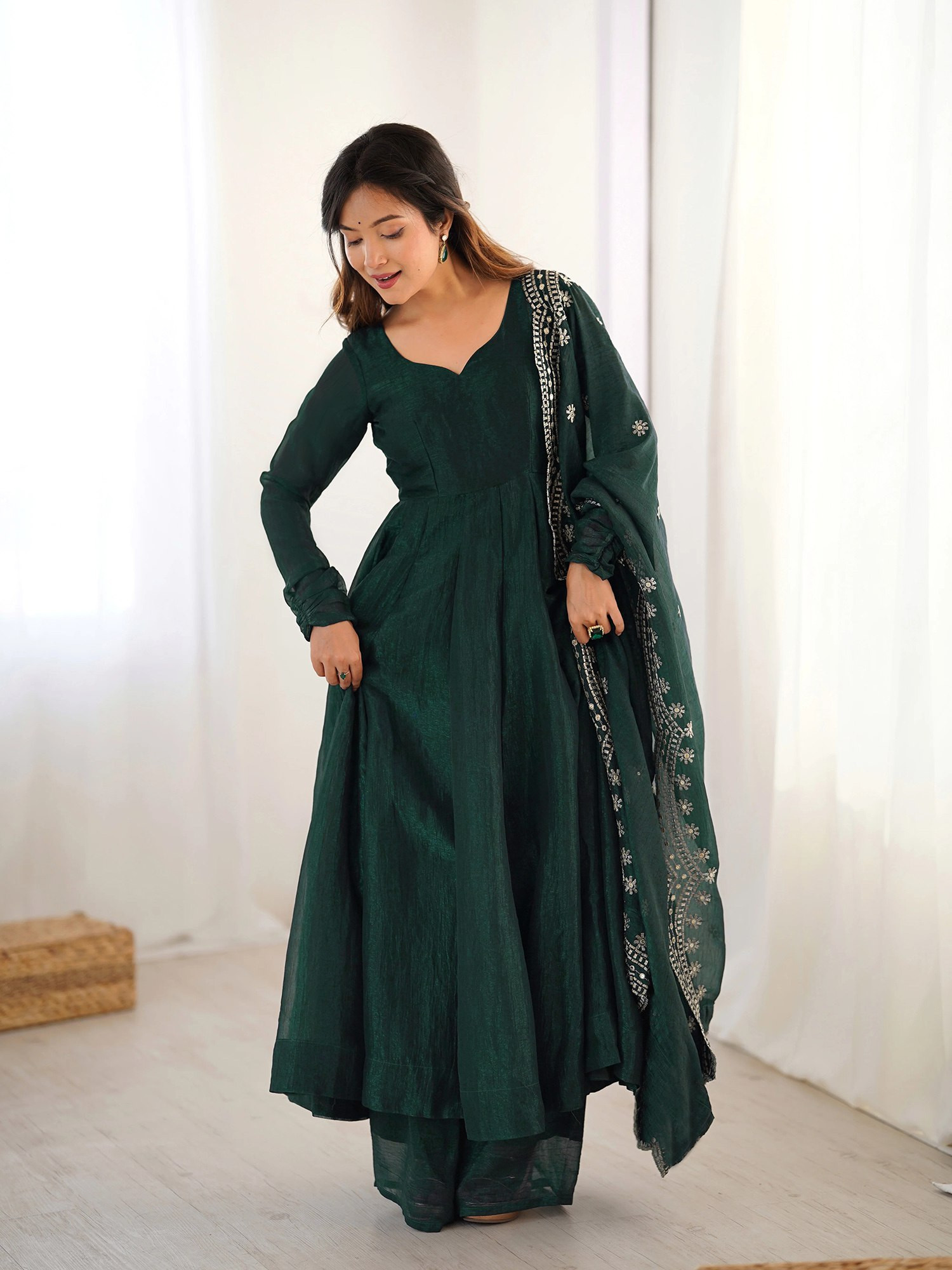 Elevate your ethnic style with this elegant Women’s Kurta Pant Dupatta Set crafted from premium vichitra fabric. The beautifully embroidered kurta with a graceful 44-inch length and 3/4th sleeves adds charm and sophistication. Designed in a soothing green color, this set is perfect for festive occasions, parties, and family gatherings.