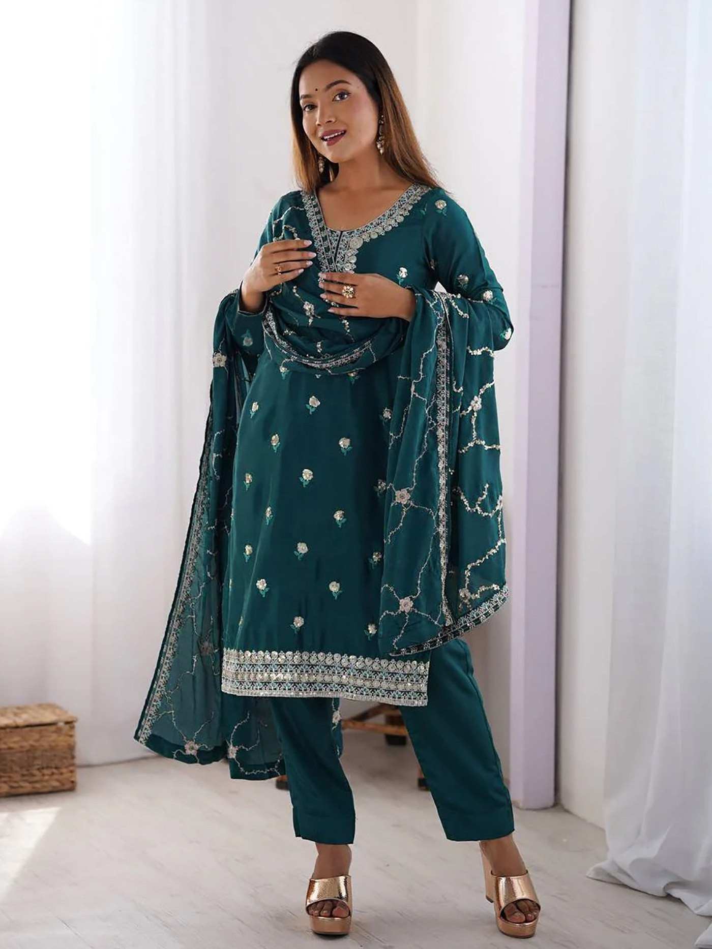 Upgrade your ethnic wardrobe with this elegant Women’s Kurta Pant Dupatta Set in soothing Rama Green.