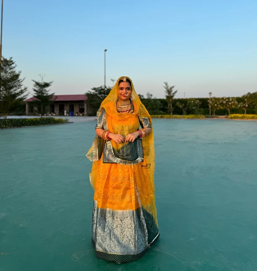 The vibrant yellow organza fabric radiates joy and positivity, draping gracefully for an airy, ethereal effect. The rich Banarasi border, renowned for its intricate patterns and opulent appeal, adds a touch of timeless grandeur. Every detail of this poshak reflects meticulous craftsmanship and refined elegance.