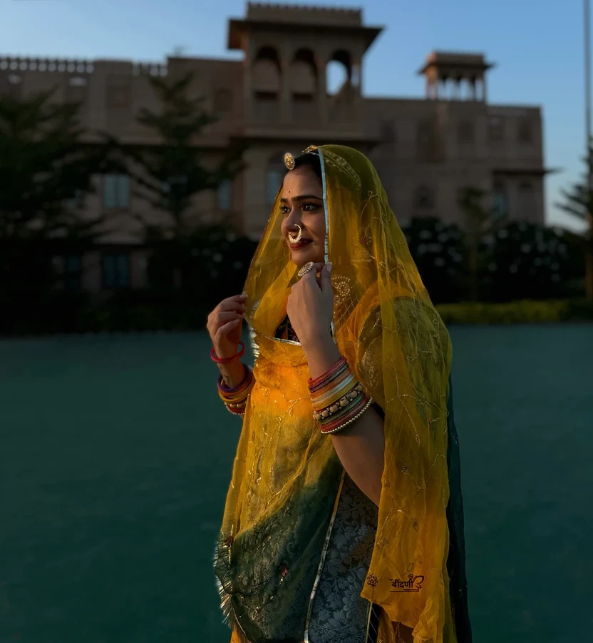 Ideal for weddings, festive celebrations, or any event where you wish to make a radiant impression, this Bindani creation is a perfect fusion of heritage and contemporary style. Step into a world of sunlit charm and let this captivating yellow organza poshak elevate your wardrobe. With its vibrant color and exquisite detailing, it promises to make you shine with elegance and grace.